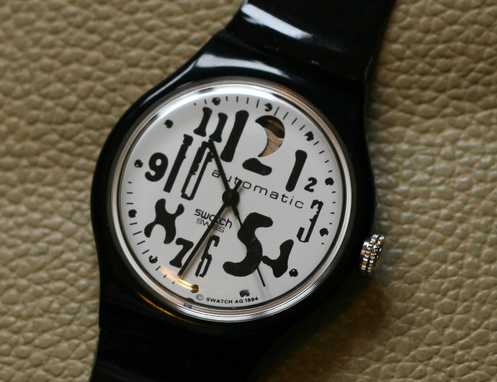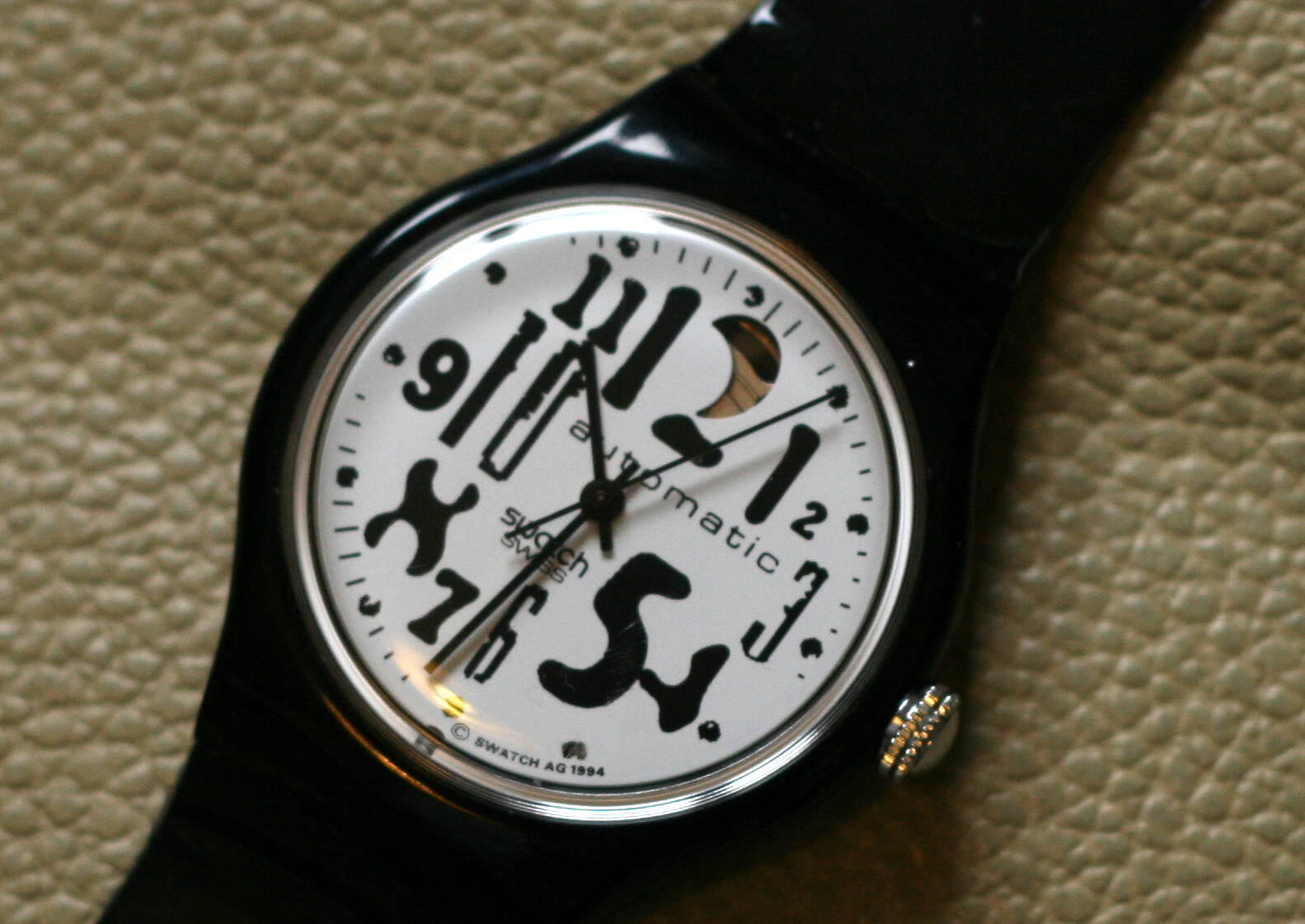 * Black hands and black secound hand with prominent silver crown